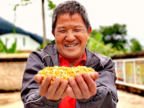 金秋十月,載滿了收獲的喜悅和玉米的香甜。景谷縣正興鎮(zhèn)的農戶手捧金黃色的籽粒,喜悅綴滿了眉梢。(李沿 攝)