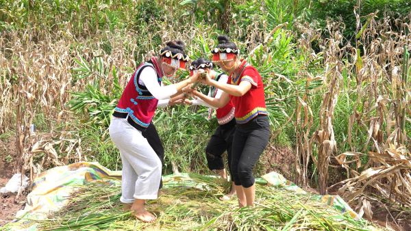 儀式感滿滿慶豐收。金秋時節(jié),稻浪飄香,傈僳族群眾將割下的谷穗鋪在田邊的布上,婦女們邊用腳搓谷穗邊歡騰地唱著:“喳務扎羅(新米節(jié)到了)羅!新米節(jié)呱切切(跳戛)……”(李建紅 攝)