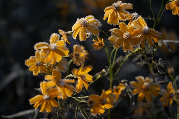 霜降之后晝夜溫差大,迎著早晨的第一抹陽光,晚間花朵上結起的寒霜也在慢慢褪去。(黃曉湘 攝)