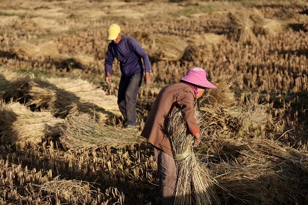 秋收后的田塊空曠了許多,農家人趁著晴天,在自家收割后的稻田里撿拾著脫粒后的秸稈。(任智云 攝)