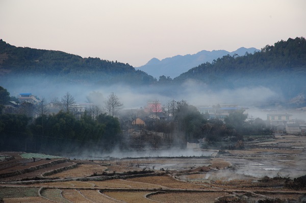深秋的早晨,輕紗似的薄霧籠罩著村居田野,宛若仙境。(高婭 攝)