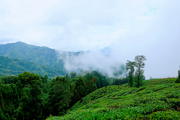 梁河縣大廠鄉回龍茶山在輕霧繚繞中“醒”來,勤勞的茶農正在采茶,身后的背簍里承載著茶農的希望。(李佳佳 攝)
