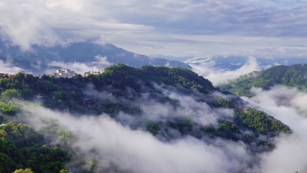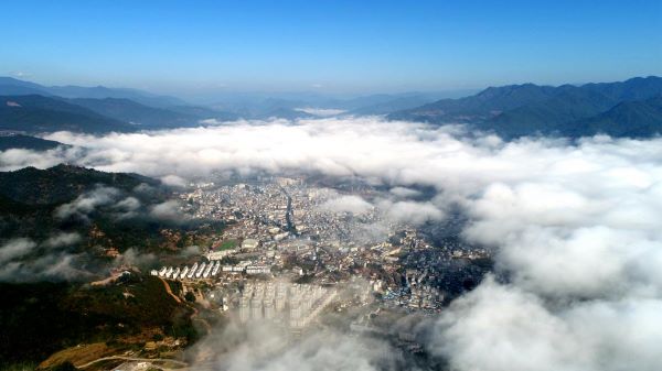 秋來,銀生霧起。踏霧登高,極目遠眺。山城隱隱,半掩半羞半遮面。(蘭開翔 攝)