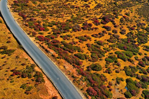 金秋十月,公路旁漫山遍野的花與金黃的大地勾勒出了一幅秋天的美景。(王強 攝)