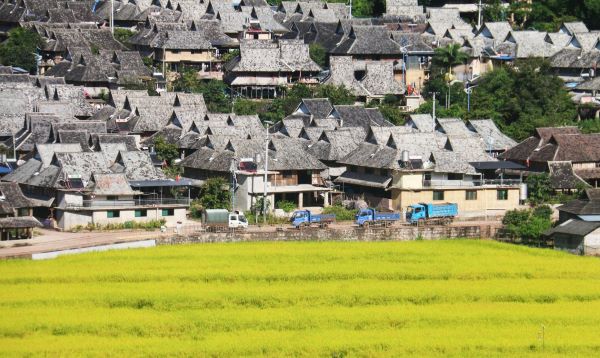 金燦燦的稻穗在風中翩翩起舞,仿佛是在慶祝收獲的喜悅。村前一輛輛農用車滿載著村民的希望,行駛在通往致富的小路上;一幢幢別具特色的傣樓,是傣族人民幸福美滿的港灣。(郭艷梅 攝)