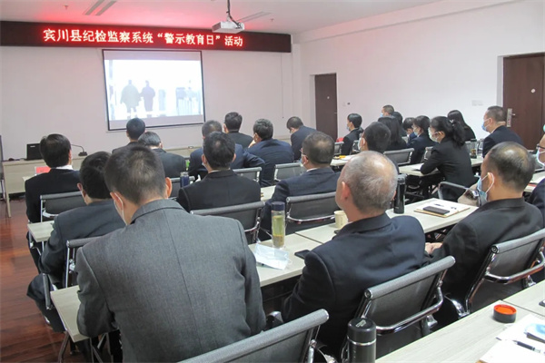 賓川縣紀委監委組織紀檢監察干部觀看警示教育片。