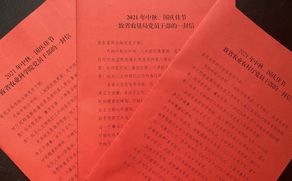 “與親友賞月出游共話情誼之時,莫忘時刻繃緊紀(jì)律弦,不碰紅線清風(fēng)延……”送上祝福的同時,信中的內(nèi)容也提醒廣大黨員干部嚴(yán)格貫徹落實中央八項規(guī)定精神,過一個風(fēng)清氣正的廉潔之節(jié)。同時,駐省農(nóng)業(yè)農(nóng)村廳紀(jì)檢監(jiān)察組將該信送到了3家綜合監(jiān)督單位的黨員干部手中。
