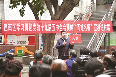 黨的十九屆五中全會召開以來,重慶市巴南區組織由基層干部、教師、民間藝人等基層理論骨干組成的宣講團,利用評書、快板、三句半、木洞山歌等形式宣傳全會精神。圖為2020年12月2日,巴南區魚洞街道魚新街社區舉行學習貫徹黨的十九屆五中全會精神“百姓名嘴”宣講進村居活動。新華社記者 唐奕 攝