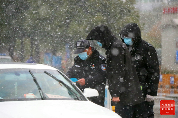 戰(zhàn)疫情,斗風(fēng)雪。在湖北枝江防疫檢查點(diǎn)上,公安民警頂風(fēng)冒雪堅(jiān)守在防疫一線,嚴(yán)格執(zhí)行過往車輛掃碼、登記等防控舉措,他們的堅(jiān)守成為了戰(zhàn)疫路上別樣的“警色”。(湖北省枝江市紀(jì)委監(jiān)委供 許俊富 攝)