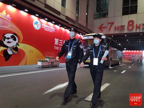 上海市公安局國家會(huì)展中心治安派出所加強(qiáng)對(duì)場館的消防安全巡檢,對(duì)發(fā)現(xiàn)的各類火災(zāi)隱患及時(shí)督促整改,確保館內(nèi)消防安全工作萬無一失。圖為第三屆中國國際進(jìn)口博覽會(huì)期間,該所民警在館內(nèi)開展消防安全巡檢。(上海市紀(jì)委監(jiān)委駐市公安局紀(jì)檢監(jiān)察組供 謝繼恩 攝)
