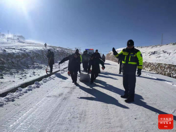 1月5日清晨,西藏自治區(qū)薩嘎縣轄區(qū)普降大雪,積雪深度達(dá)50mm,國道積雪結(jié)冰,群眾出行受阻。廣大公安民(輔)警積極投入到鏟雪、清路工作中,以實(shí)際行動(dòng)向警旗添彩。(西藏自治區(qū)紀(jì)委監(jiān)委供 林文平 攝)