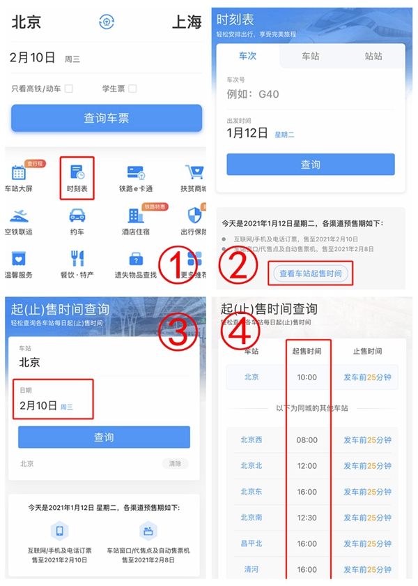 按上圖操作可在12306客戶端查詢不同站點和日期的開售時間(制圖:沈東方)