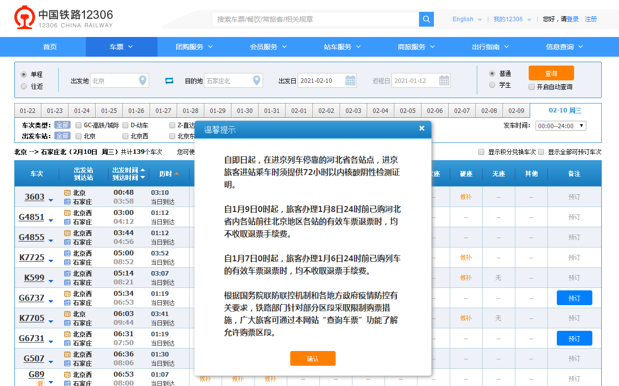 在12306官網(wǎng)搜索2月10日從北京去往石家莊的火車票,網(wǎng)頁會彈出相關(guān)提醒。