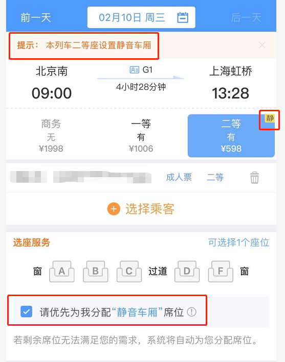 設(shè)置了“靜音車廂”的車次,在二等座的右上角有個“靜”字作為提示,旅客可以勾選“請優(yōu)先為我分配‘靜音車廂’席位”,勾選后提交訂單即可。