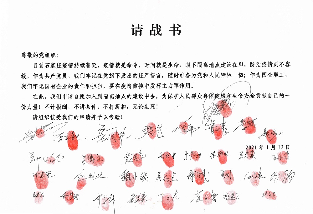 1月13日11時,中國鐵建華北區域總部接到石家莊市政府緊急電話通知,當地準備在正定縣建設集中隔離點,急需負責現場施工的人力、機械。正參與建設石家莊滹沱河生態修復三期項目正定縣段和靈壽縣段的中鐵十四局集團、鹿泉區段的中鐵十二局集團接到任務立即行動,召開動員大會,清點人員、檢查設備,做好防疫和馳援準備。圖為1月13日,中鐵十四局集團石家莊滹沱河生態修復三期項目全體職工簽下請戰書。(中國鐵建供圖)
