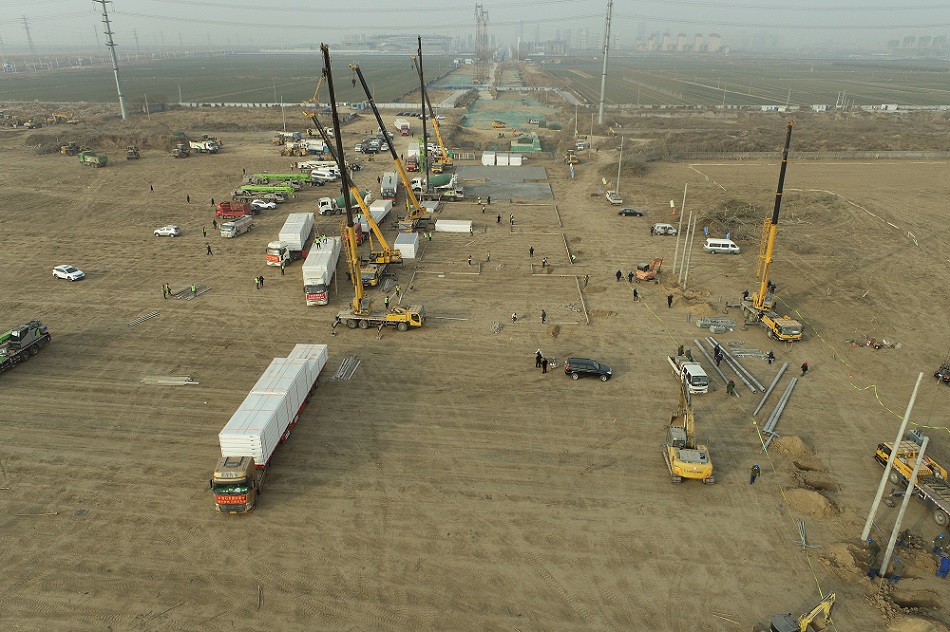 圖為1月14日上午11時許,工人開始在石家莊市集中隔離點建設工地安裝板房。(中國鐵建供圖)