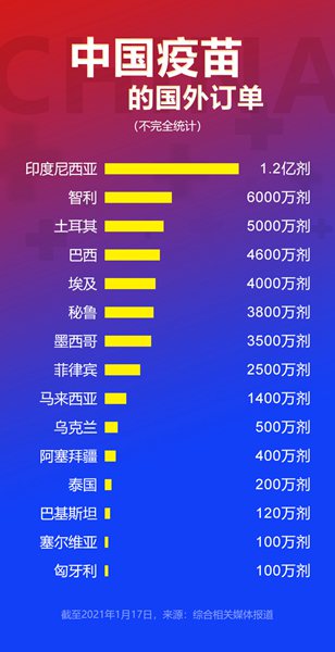 據(jù)新華網(wǎng)報(bào)道,自2020年底中國(guó)首個(gè)疫苗正式上市以來,阿聯(lián)酋、巴林、摩洛哥、巴基斯坦、土耳其、阿根廷、埃及、巴西、泰國(guó)、墨西哥、秘魯?shù)热?0多個(gè)國(guó)家已與中國(guó)簽署新冠疫苗訂購(gòu)協(xié)議。其中,阿聯(lián)酋、埃及、巴林3國(guó)已經(jīng)正式批準(zhǔn)使用中國(guó)疫苗,還有多國(guó)有購(gòu)買意向。而從訂單數(shù)量來看,中國(guó)疫苗已經(jīng)拿到16個(gè)國(guó)家及地區(qū)超5億劑疫苗的合同。