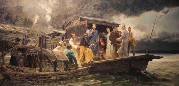 何紅舟、黃發祥創作的《啟航——中共一大會議》,再現了中共一大在南湖召開的場景,畫面中參加會議的代表正舉步邁上畫舫。