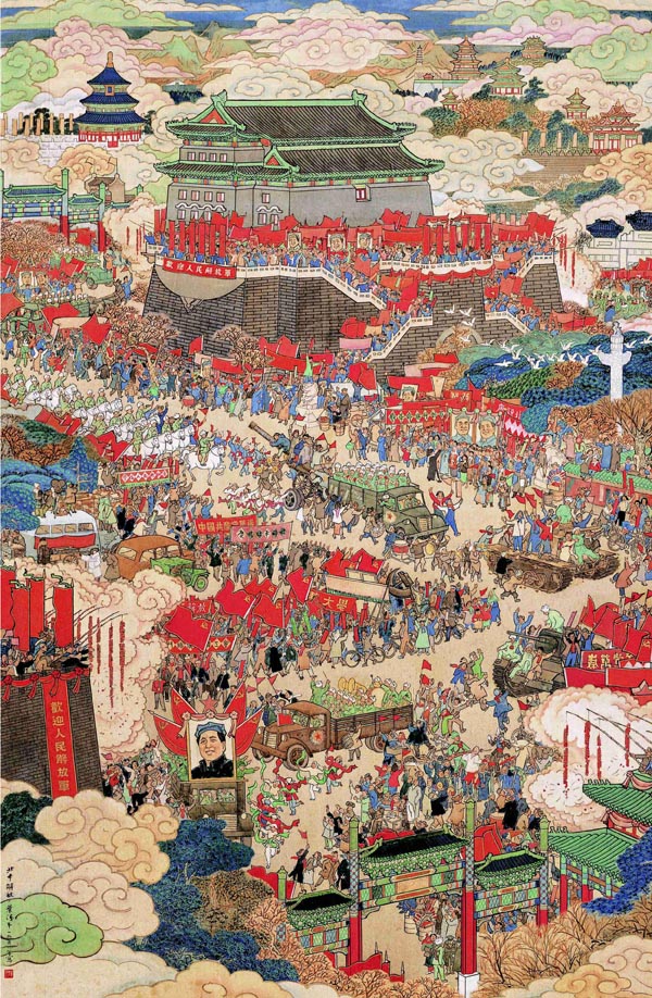 作品描繪的是1949年,在廣大群眾的簇擁歡迎下,人民解放軍秩序井然的入城式場景。通過畫面,我們可以看到從前門經未建成的天安門廣場,再到天壇,在呈S形構圖的道路上,人民群眾歡欣鼓舞、鑼鼓喧天、旗幟飄揚,一片熱烈歡騰的景象——歷史從此翻開了新的一頁。