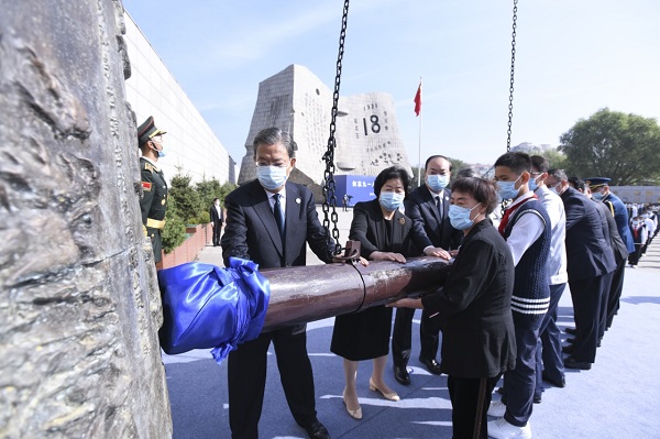 9時18分,趙樂際等領導同志和群眾代表神情凝重地推動鐘槌擊響“警世鐘”。14響鐘聲,寓意著中國人民14年艱苦卓絕的抗戰歷程。沈陽全城拉響防空警報。同一時間,遼寧省其余13個城市也拉響防空警報3分鐘,火車、輪船、汽車鳴笛。
