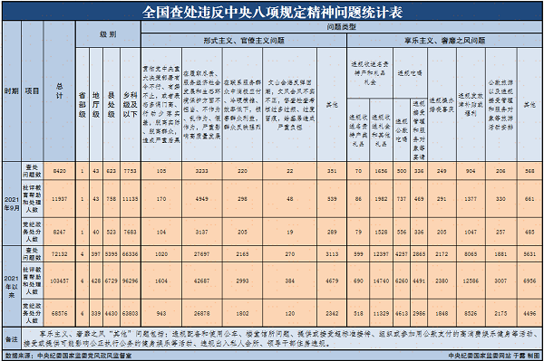 10月28日,中央紀委國家監委公布了2021年9月全國查處違反中央八項規定精神問題匯總情況。今年9月,全國各級紀檢監察機關共查處違反中央八項規定精神問題8420起,批評教育幫助和處理11937人,其中黨紀政務處分8247人。這是中央紀委國家監委連續第97個月公布月報數據。