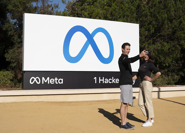 今年10月,美國(guó)社交媒體巨頭臉書宣布更名為“元”(Meta),聚焦元宇宙。圖為在美國(guó)舊金山灣區(qū),人們?cè)?ldquo;元”標(biāo)志牌前留影。(圖片來(lái)源:新華社)