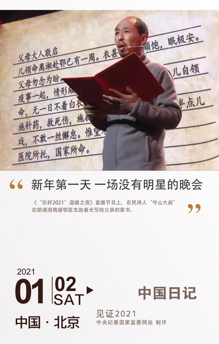 晚會的小高潮是詩朗誦。由“人民英雄”國家榮譽稱號獲得者、中國工程院院士張伯禮和農民詩人“守山大叔”合作,朗讀湖南中南大學湘雅醫院援鄂抗疫國家醫療隊隊員、重癥醫學科主治醫師趙春光與父親之間的家書。