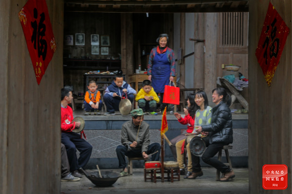 年關將至,福建省大田縣濟陽鄉濟陽村村民一家人在院子里敲鑼打鼓,排練南音、高甲戲、舞獅等民俗節目,歡歡喜喜迎新年。(福建省大田縣紀委監委供 田紀軒 攝)