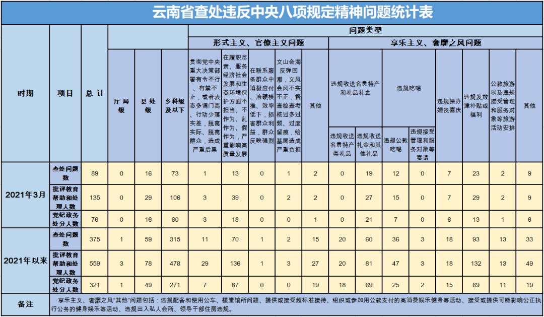 4月27日,云南省紀委監委公布了2021年3月全省查處違反中央八項規定精神問題匯總情況。當月,全省各級紀檢監察機關共查處違反中央八項規定精神問題89起,批評教育幫助和處理135人,其中黨紀政務處分76人。