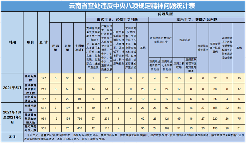 近日,云南省紀委監委公布了2021年5月云南省查處違反中央八項規定精神問題匯總情況。5月,全省各級紀檢監察機關共查處違反中央八項規定精神問題127起,批評教育幫助和處理211人,其中黨紀政務處分117人。