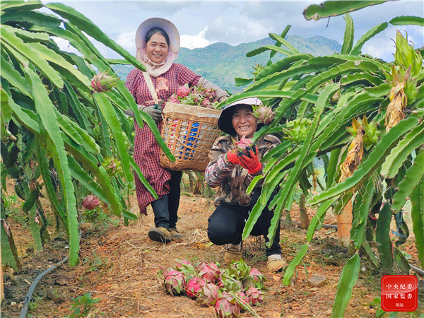 云南省龍陵縣碧寨鄉(xiāng)種植的火龍果迎來豐收,果農(nóng)們正忙著采摘、分撿、裝箱。火紅的火龍果讓村民的生活越來越紅火,也讓鄉(xiāng)村產(chǎn)業(yè)振興之路越走越寬。(云南省龍陵縣紀(jì)委監(jiān)委 王龍芹 攝)
