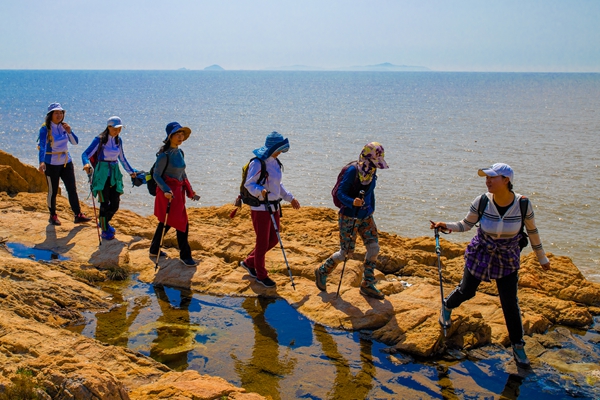 浙江省玉環(huán)市挖掘當?shù)睾Q筚Y源,以濱海景觀帶為主線,邀請運動愛好者們跨山越海徒步運動,一邊看風景,一邊玩游戲,用腳步丈量山海之美。圖為運動愛好者正在海岸線徒步行走,感受海島魅力。(浙江省玉環(huán)市紀委監(jiān)委供 陳嗣國 攝)