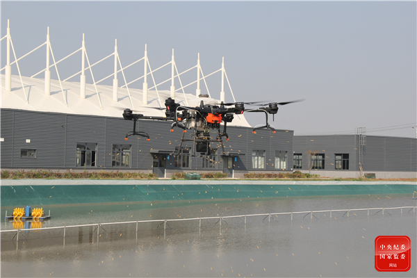 江蘇省常州市金壇區(qū)實施萬畝數(shù)字化漁場項目,將物聯(lián)網(wǎng)、云計算、大數(shù)據(jù)技術(shù)與傳統(tǒng)河蟹養(yǎng)殖相結(jié)合,實現(xiàn)了機械化、智能化、信息化在水產(chǎn)養(yǎng)殖和銷售領(lǐng)域的有益探索。圖為養(yǎng)殖戶通過無人機向蟹塘投放餌料。(江蘇省常州市金壇區(qū)紀(jì)委監(jiān)委 李嘯 攝)