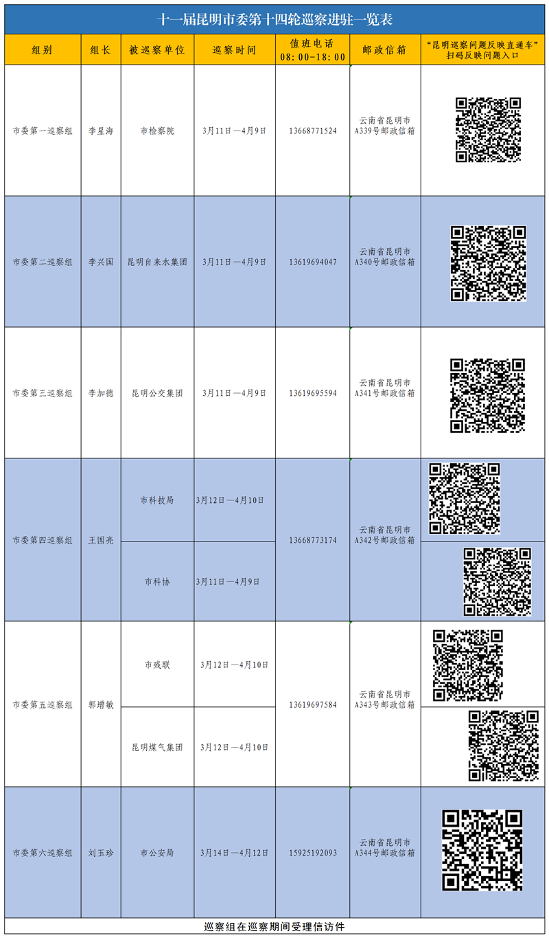 根據昆明市委統一部署,十一屆昆明市委第十四輪巡察對市公安局、市檢察院、市科技局、市科協、市殘聯、昆明公交集團、昆明煤氣集團、昆明自來水集團等8家單位開展巡察“回頭看”。其中,對公安系統巡察“回頭看”以市縣上下聯動巡察的方式開展。