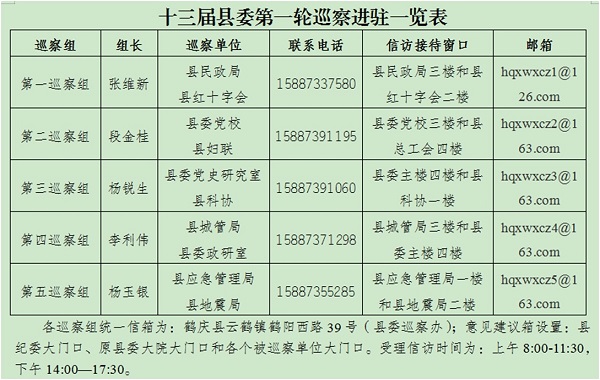 本輪巡察進駐時間為7月15日至8月3日。巡察期間,各巡察組設立工作電話和聯系郵箱、信箱,主要受理反映被巡察黨組織領導班子及其成員問題的來信來電來訪。