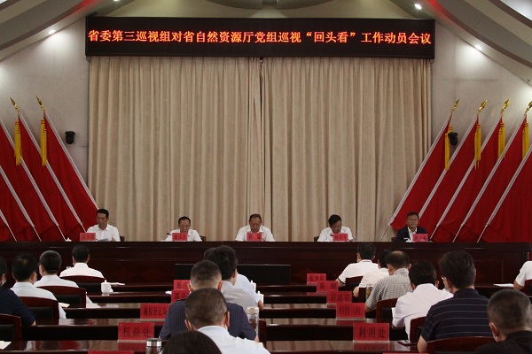 按照省委統一部署,8月12日,省委第三巡視組對省自然資源廳黨組巡視“回頭看”工作動員會召開。會前,省委第三巡視組組長程猛主持召開與省自然資源廳黨組書記何汝利、廳長高中建的見面溝通會,傳達了省委書記阮成發聽取巡視工作有關情況匯報時的講話要求,通報了巡視“回頭看”工作安排。會上,程猛作了動員講話,提出了要求;何汝利主持會議并作表態講話。