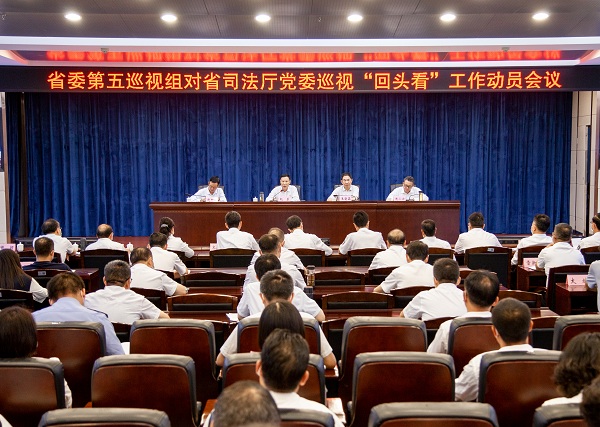 按照省委統一部署,8月13日,省委第五巡視組對省司法廳(含省監獄管理局)黨委巡視“回頭看”工作動員會召開。會前,省委第五巡視組組長趙基主持召開與省司法廳黨委書記、廳長商小云的見面溝通會,傳達了省委書記阮成發聽取巡視工作有關情況匯報時的講話要求,通報了巡視“回頭看”工作安排。會上,趙基作了動員講話,提出了要求;商小云主持會議并作表態講話。