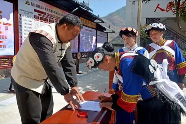 麗江市玉龍縣石鼓鎮(zhèn)魯瓦村黨員簽訂《規(guī)范操辦婚喪喜慶事宜承諾書》。和福天/攝