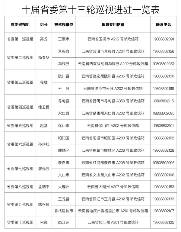 經省委批準,本輪巡視分別對玉溪市、保山市、大理州、怒江州和尋甸縣、昭陽區、麒麟區、永仁縣、蒙自市、文山市、景谷縣、勐臘縣、隴川縣、玉龍縣、香格里拉市、云縣開展巡視“回頭看”。