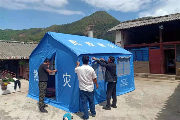 永平縣北斗鄉梅花村村務監督委員會為災民搭建救災帳篷,保障災民生活。(孫小林 攝)
