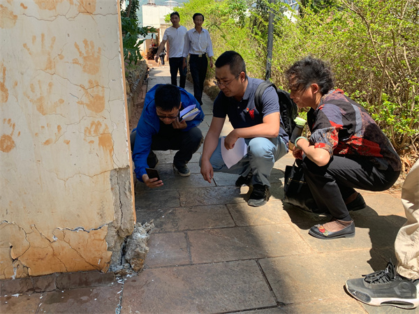 大理市下關街道紀工委在泰安社區一棟居民樓前,與評估人員共同查看記錄房屋受損情況。(馬少寅 攝)