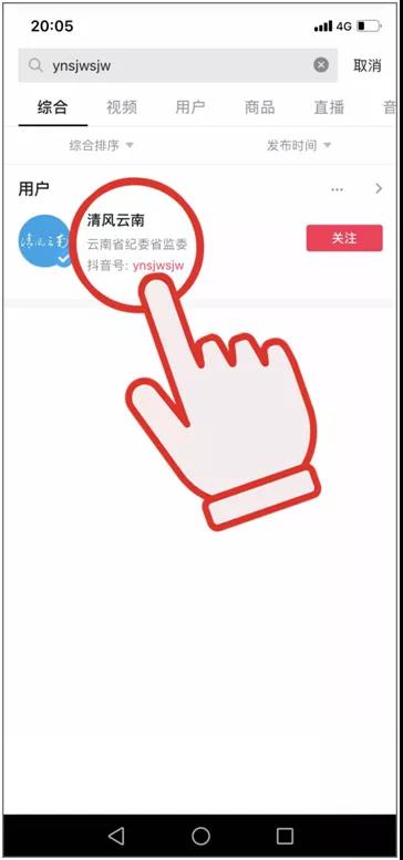 2.輸入“清風云南”抖音賬號:“ynsjwsjw”,進行搜索。