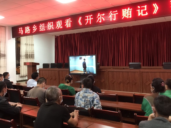 會澤縣馬路鄉組織鄉鎮黨員干部集中觀看警示片《開爾行賄記》。(容宗才 攝)