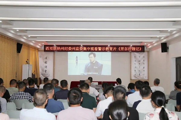 西雙版納州紀委監委組織集中觀看警示教育片《開爾行賄記》。(周榮 攝)