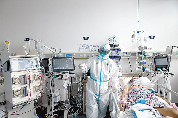 2020年3月24日,武漢,康焰在湖北省人民醫院東院區查看重癥患者。 (圖片來源:視覺中國)