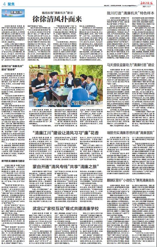 為進一步提升云南紀檢監察工作的“辨識度”和“鮮活度”,2019年1月8日,省紀委省監委宣傳部與云南法制報聯合開辦“清風云南·紀檢監察周刊”,周刊系全國首家,目前也是全國唯一一份在省級主流媒體創辦的紀檢監察類新聞周刊。創刊三年來,堅守品質化、精品化、多元化的辦刊宗旨,守正不渝,創新不止,影響力不斷擴大,并獲得一致好評,成為社會各界了解我省紀檢監察工作的重要窗口之一,在全省營造了全面從嚴治黨和反腐敗斗爭的良好氛圍。