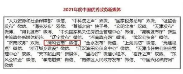 日前,“清風云南”微信公眾號在2021年中國優秀政務平臺推薦及綜合影響力評估工作中被評為2021年度中國優秀政務新媒體。