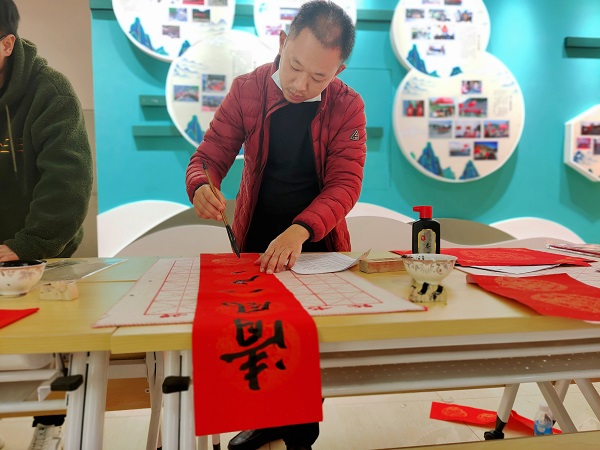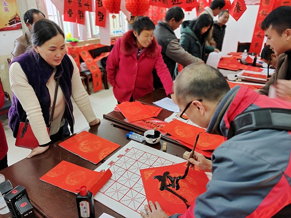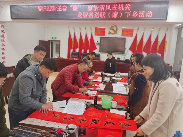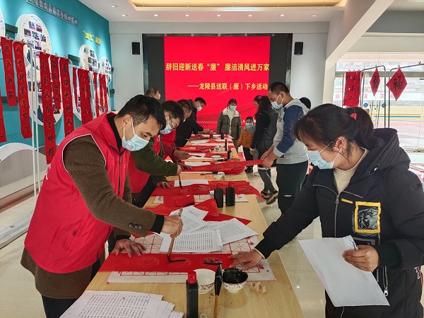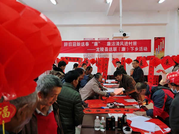 在龍江鄉赧等村,書法家現場書寫春聯,把春的喜悅和廉潔清風送入千家萬戶。(王龍芹 攝)