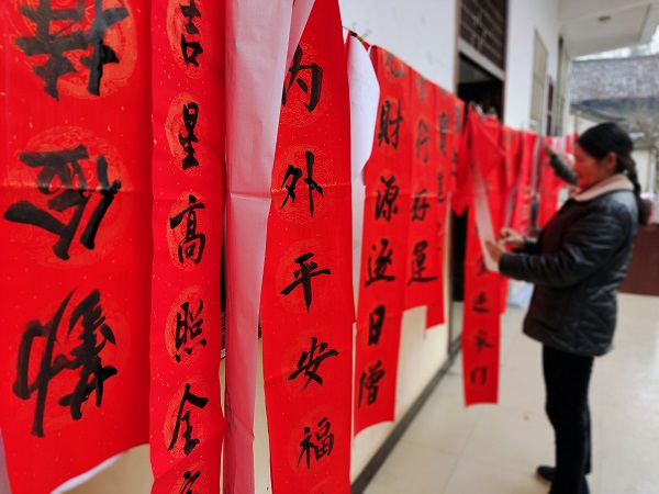 在龍陵縣新時代文明實踐中心,一副副手寫春聯為群眾度過一個歡樂祥和、清廉文明的春節送上一份祝愿。(王龍芹 攝)