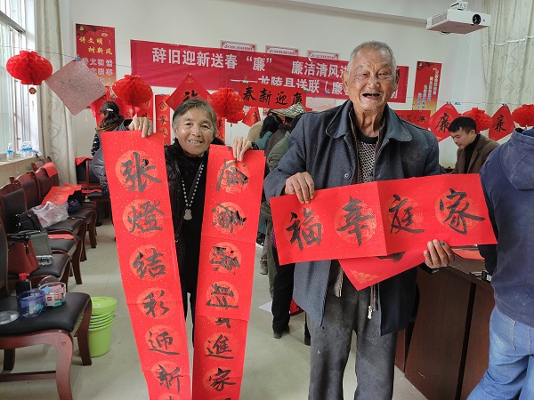 散發著淡淡墨香和濃濃祝福的廉聯,傳遞著廉政清風和惠民新風。(王龍芹 攝)
